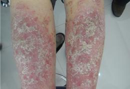腿部皮损斑块泛大,鳞屑掉落严重