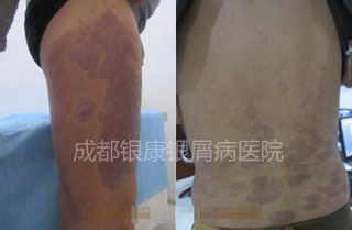第二阶段采用集中强化治疗,3D净血细胞祛癣疗法配合物理光疗、以及中医中药轮换治疗,内调免疫外祛皮损,经过一段时间的治疗清扬的皮损部位变平变暗、皮屑减少。